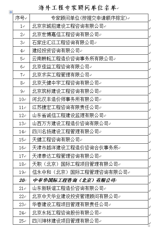 中國建設工程造價(jià)管理協(xié)會(huì )經(jīng)過(guò)對企業(yè)規模、人力資源、海外業(yè)務(wù)及經(jīng)驗等因素的綜合考量,中審華國際工程咨詢(xún)(北京)有限公司被評選為海外工程專(zhuān)家顧問(wèn)單位。