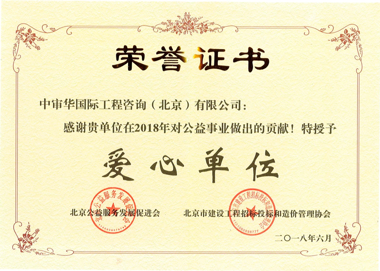 中審華國際工程咨詢(xún)(北京)有限公司獲北京公益服務(wù)發(fā)展促進(jìn)會(huì )頒發(fā)的2018年對公益事業(yè)做出貢獻的“愛(ài)心單位”。